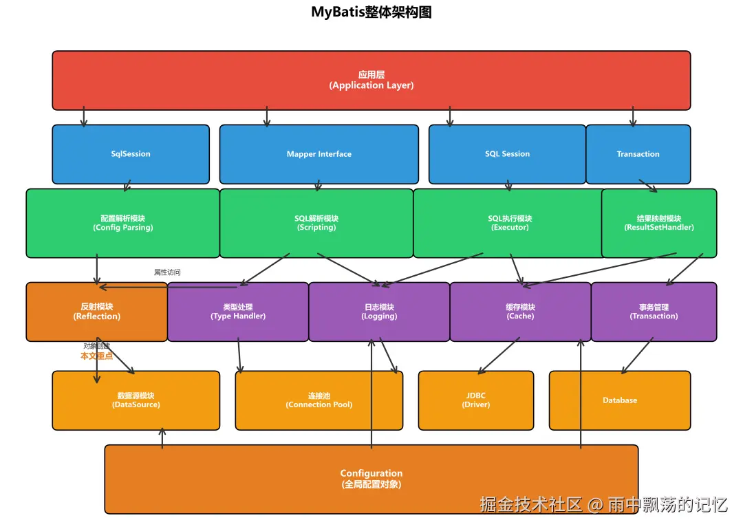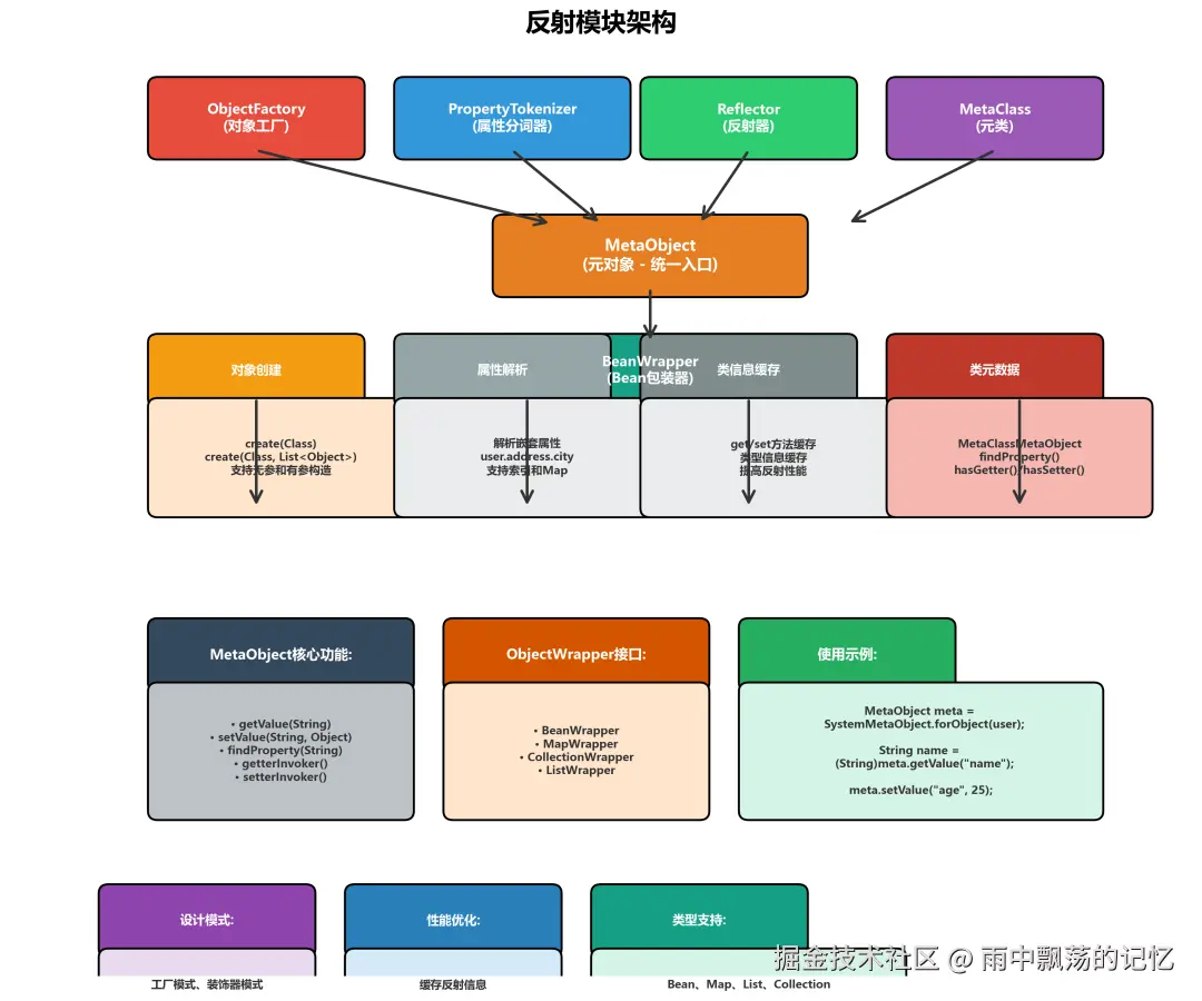 从架构图可以看出,MyBatis采用了分层设计,而反射模块(Reflection)位于基础支撑层,是整个框架的核心基础设施。