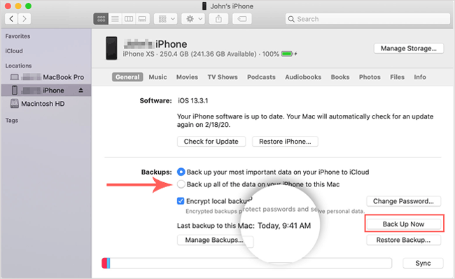 步骤 3. 在"备份"部分,选择"将 iPhone 上的所有数据备份到此Mac "。