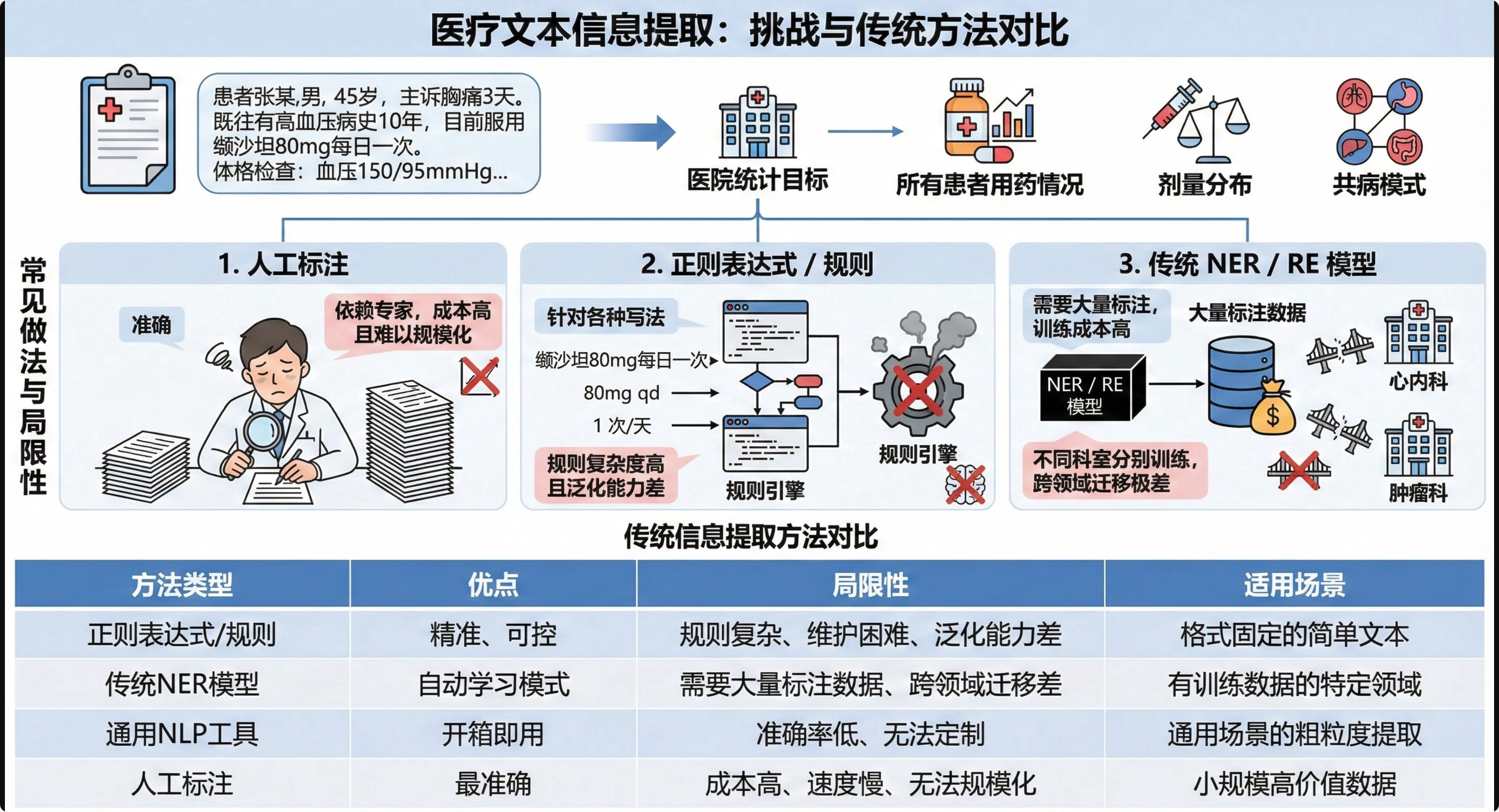 - 针对"缬沙坲80mg每日一次 / 80mg qd / 1 次/天"等各种写法,规则复杂度高且泛化能力差
