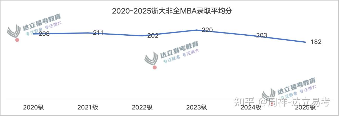 我们可以先针对浙大非全日制 MBA 项目看一下情况,杭州达立易考教育统计了从 2020 到 2025 共计六年时间的录取平均分数据,这六年以来其实代表了项目的总体变化趋势。刚开始的2020 、2021 、2022年三年时间,非全日制MBA项目录取平均分基本稳定在 205 分上下,也侧面说明浙大MBA项目的报考热度、初试难度等方面整体趋于平稳,项目的竞争节奏没有太大波动。但是到了 2023 年出现了一个波动,当年的录取平均分直接飙升至 220 分!如果不了解背景的一定也不会知道其根本原因是什么,因为2023年浙大MBA项目提前批面试优秀资格录取的考生占比达到80%,也导致复试的竞争激烈程度达到最高峰,如今提前批面试都在正常进行组织,根据2026年提前批面试(新质生产力与神面试)申请情况,优秀资格给予的力度是比较大的,别说没参加提前批面试申请的考生,即便是拿到优秀资格的考生,如果初试成绩不占很大优势,也需要针对复试好好做准备,因为没有明面上的政策护体的话,今年部分优秀资格考生或许也会落榜。加上今年考试难度下调这么多,高分段位的考生比例应该不在少数。去年的录取平均分之所以会低至 182 分,主要原因是考试难度的影响,其实跟报考情况没有直接的关联性。