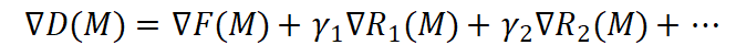 目标函数对掩模变量的梯度目标函数梯度(∇F)与各罚函数梯度(∇R₁、∇R₂)的加权组合:
