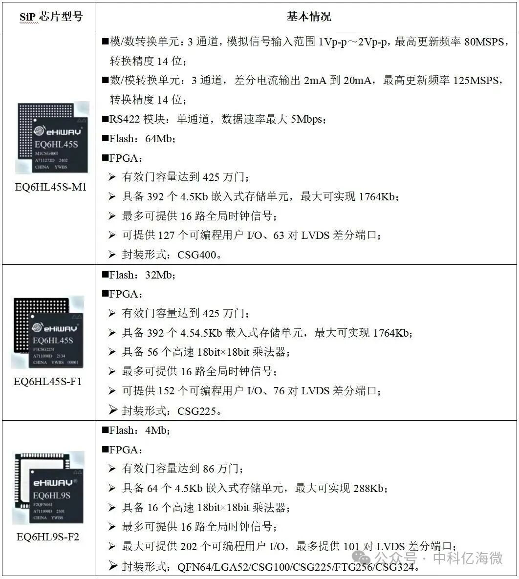 在芯片设计与系统集成领域,单一芯片的性能突破已不再是唯一的追求。如何通过系统级的创新,实现整体方案的最优化,成为行业发展的关键命题。在追求电子系统更高性能、更小体积与更低成本的今天,系统级封装(SiP)技术正成为破解难题的关键路径。中科亿海微深耕可重构计算芯片与系统领域,已成功研制出多款具有代表性的SiP芯片,包括EQ6HL45S-M1、EQ6HL45S-F1、EQ6HL9S-F2等。这些芯片面向高精度惯导系统、飞行控制系统、光纤陀螺仪、具身智能体关节模组、工业自动化控制系统等多元应用场景打造的集成化解决方案。这些合封类芯片能以全国产化芯片形式承载高精度信号采集、数据运算、调制信号生成、通信、控制的应用需求。