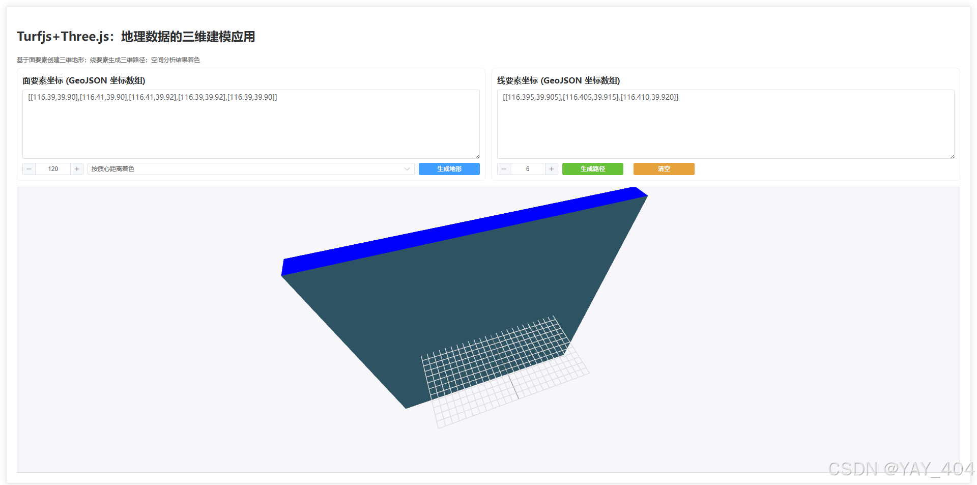 在 WebGIS 开发中,三维可视化不再局限于地球 / 地图场景 ------ 纯三维建模(Three.js)能更灵活地展示地理数据的空间形态与分析结果。Turf.js 作为前端空间分析核心库,可完成地理坐标处理、距离计算、质心分析等基础操作;Three.js 则专注于三维几何体创建、材质渲染、交互控制,两者结合可实现 "地理数据 → 空间分析 → 三维建模 → 可视化着色" 的完整流程。本文将通过实战案例,带你掌握 Turf.js 与 Three.js 的结合使用方法,实现面要素三维地形建模、线要素三维路径生成、空间分析结果着色三大核心功能。