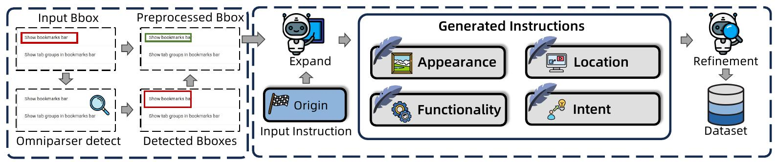 多视角指令增强。我们流程的核心在于丰富指令的多样性。我们利用 GPT-4.1 (OpenAI, 2025a) 从我们在分析中确定的四个基本分析视角(外观、功能、位置和意图)生成新的指令。对于每个数据实例,模型接收带有突出显示的目标元素的屏幕截图,并被提示创建一组高质量、多样化的措辞。为了减轻 LLM 的幻觉并确保严格的一对一映射,每个生成的指令都经过验证步骤,其中 GPT-4.1 确认它明确地仅指目标元素。这个过程产生了一个高质量、多视角的语料库,专门用于教授复杂的推理。