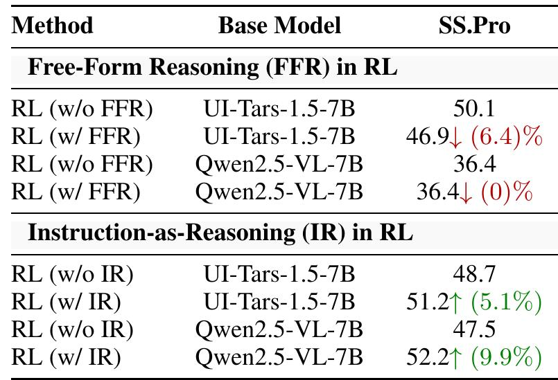 指令即推理(IR)与自由形式推理(FFR)。鉴于推理至关重要,哪种推理方式有效?先前的工作(Lu et al., 2025;Yang et al., 2025;Zhou et al., 2025;Tang et al., 2025)表明,FFR难以优化,甚至可能降低性能。我们在表8中针对我们的IR方法测试了这个假设。如表格顶部所示,应用FFR会降低UI-Tars-1.5-7B和Qwen2.5-VL-7B的性能,证实了先前的发现。例如,它导致UI-Tars-1.5-7B的SS.Pro相对下降6.4%。相比之下,底部部分显示,使用我们的IR方法训练模型可以显著提高准确性。因此,我们可以从实验中得出结论,非结构化的FFR无法改进,而IR是解锁GUI接地的有效推理的关键。