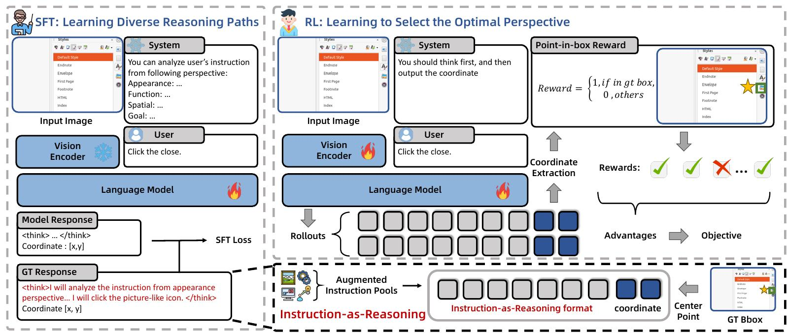 - 指令即推理范式。在上述见解的基础上,我们提出了指令即推理范式,该范式将指令从静态输入重新定义为动态推理路径。我们通过 SFT+GRPO 训练框架来实现这一点,该框架首先教导模型使用不同的指令视角作为推理路径,然后激励它为任何给定的 GUI 场景选择最佳的分析推理路径。
