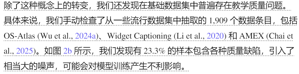 虽然利用指令多样性很有前景,但其有效性取决于原始指令是否正确这一基础。但这个基础是否有效?为了探究 grounding 数据集的指令质量,我们进行了大规模的人工分析。具体来说,我们检查了来自三个著名数据集的 1,909 个样本,分别是 OS-Atlas (Wu et al., 2024a)、AMEX (Chai et al., 2025) 和 Widget Captioning (Li et al., 2020)。