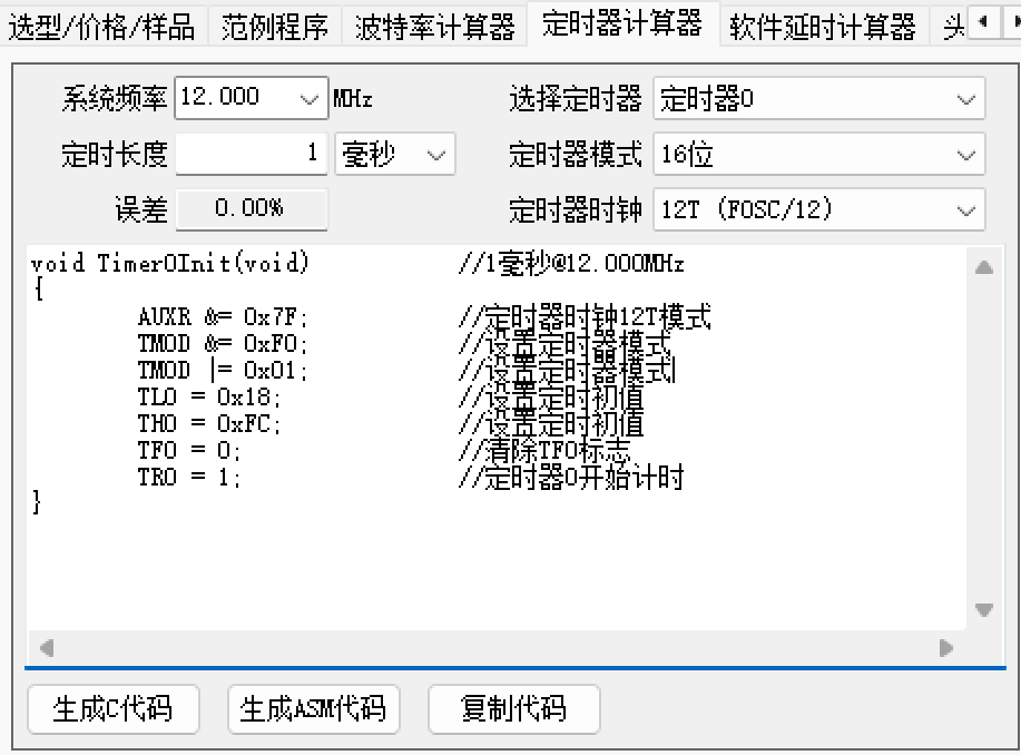 上述的代码只是基于对电路的理解来写的,实际上有更方便的方法,可以在STC-ISP软件里自动生成,但是,只能生成定时器的代码,连通中断等步骤还得自己添加: