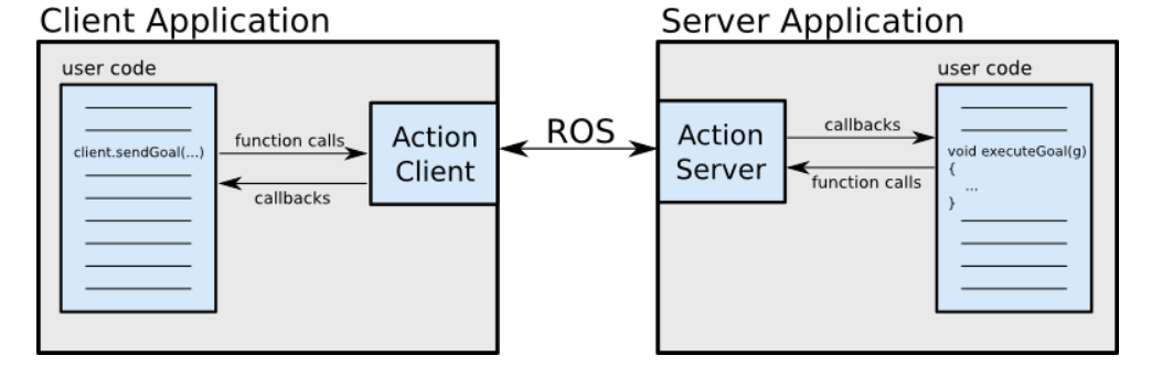 这里显示了client发送一个目标,也就是sendGoal,server接收到后执行相对应的程序,也就是excuteGoal。这是一个简单过程,但是其中,还有可能client按照设定的频率发送反馈的指令,server接收到后把反馈的结果发回给client。