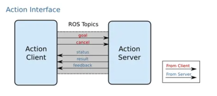 动作action是ros常用的一种通讯方式,有动作的客户端client与动作的服务端server。这里要提一下action与servcie都是具有反馈的通讯方式,那么它们之间有什么区别呢?很明显的一个区别就是,action可以按照一定的频率进行反馈当前的状态,而service只能够反馈一次,这是个很重要的点,比如在执行长时间任务的时候,用action的通信方式可以随时的查看进度,同时也可以终止请求。