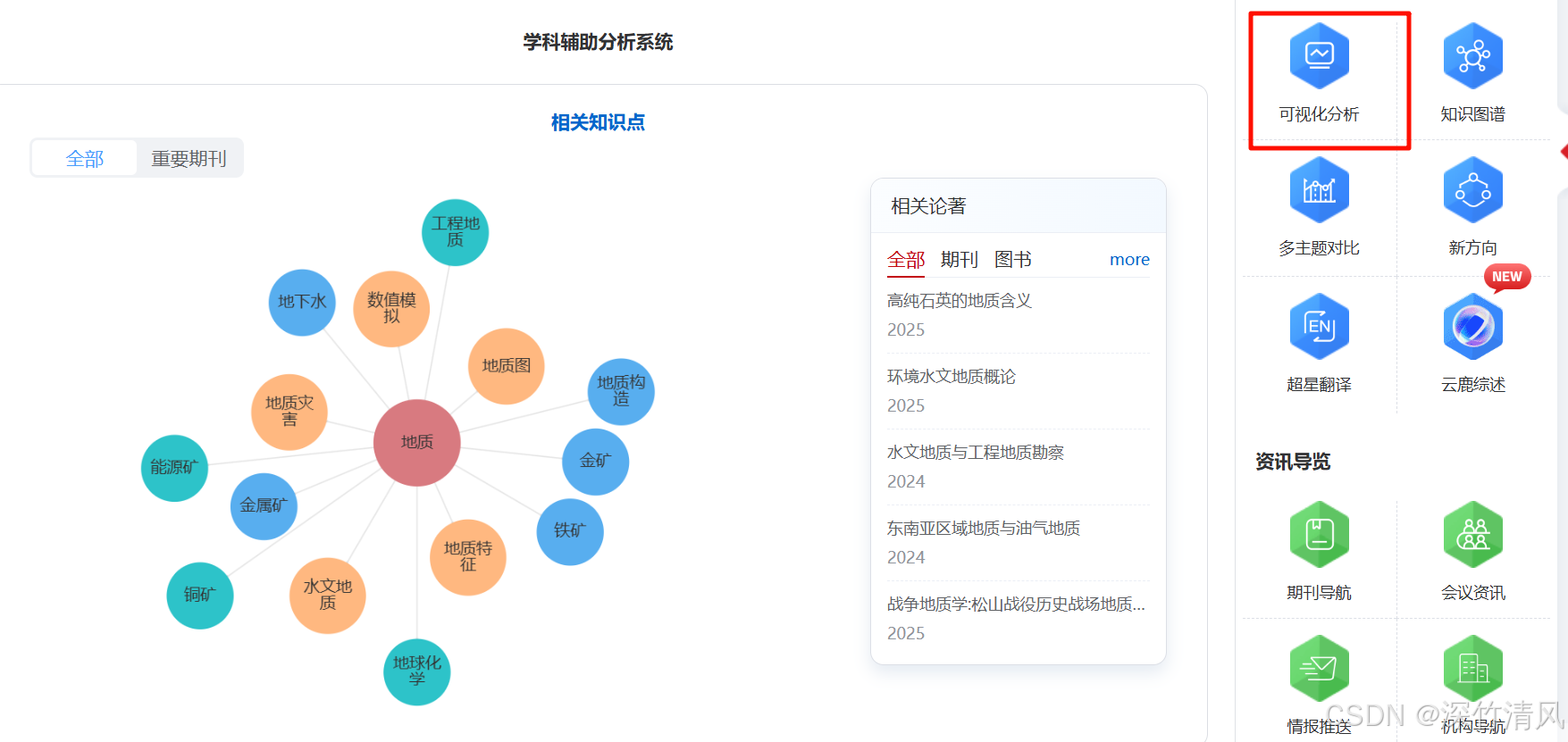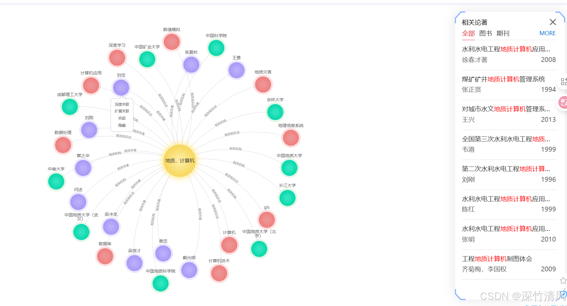 超星发现能够按照知识概念给出知识关联图谱。通过单向或双向线性知识关联构成的链状、网状结构,形成主题、学科、作者、机构、地区等关联图,从而反映出学术思想之间的相互影响和源流。