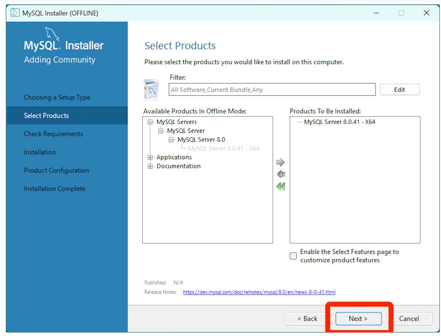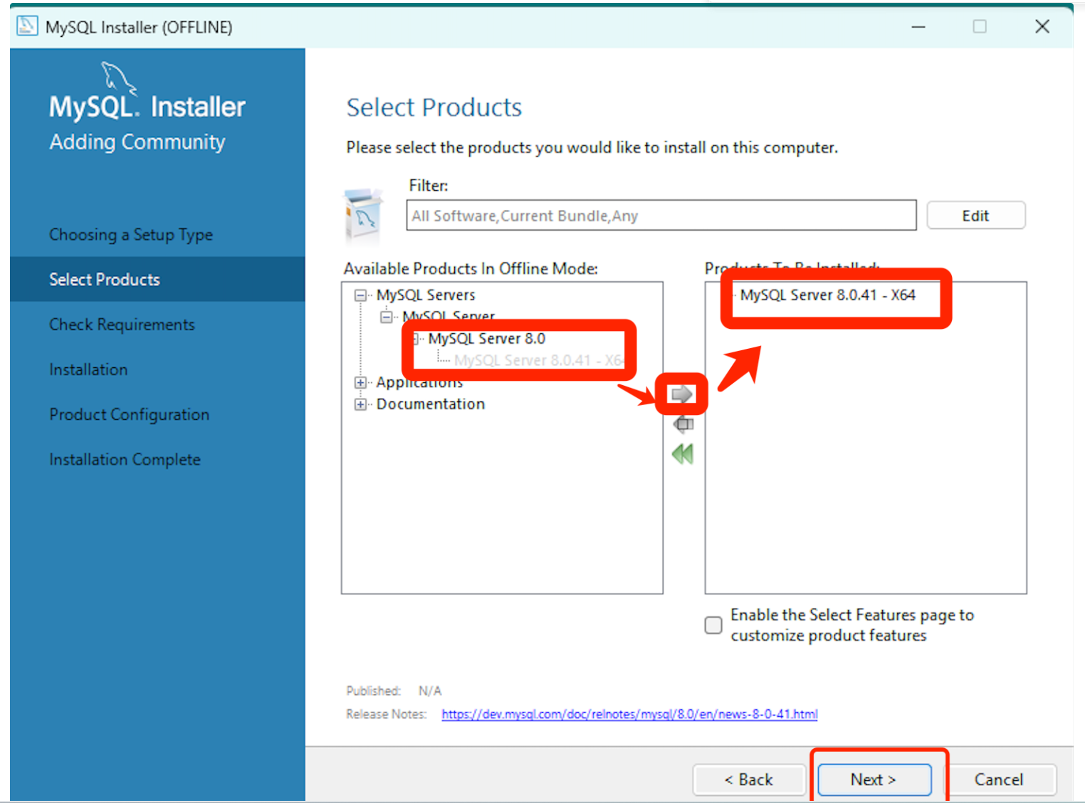 在组件列表中,找到 "MySQL Server 8.0.41- X64"(以 64 位系统为例),勾选该项。同时,你还可以根据需求选择其他组件,如 MySQL Router(用于路由数据库连接)、MySQL Workbench(图形化管理工具)等。