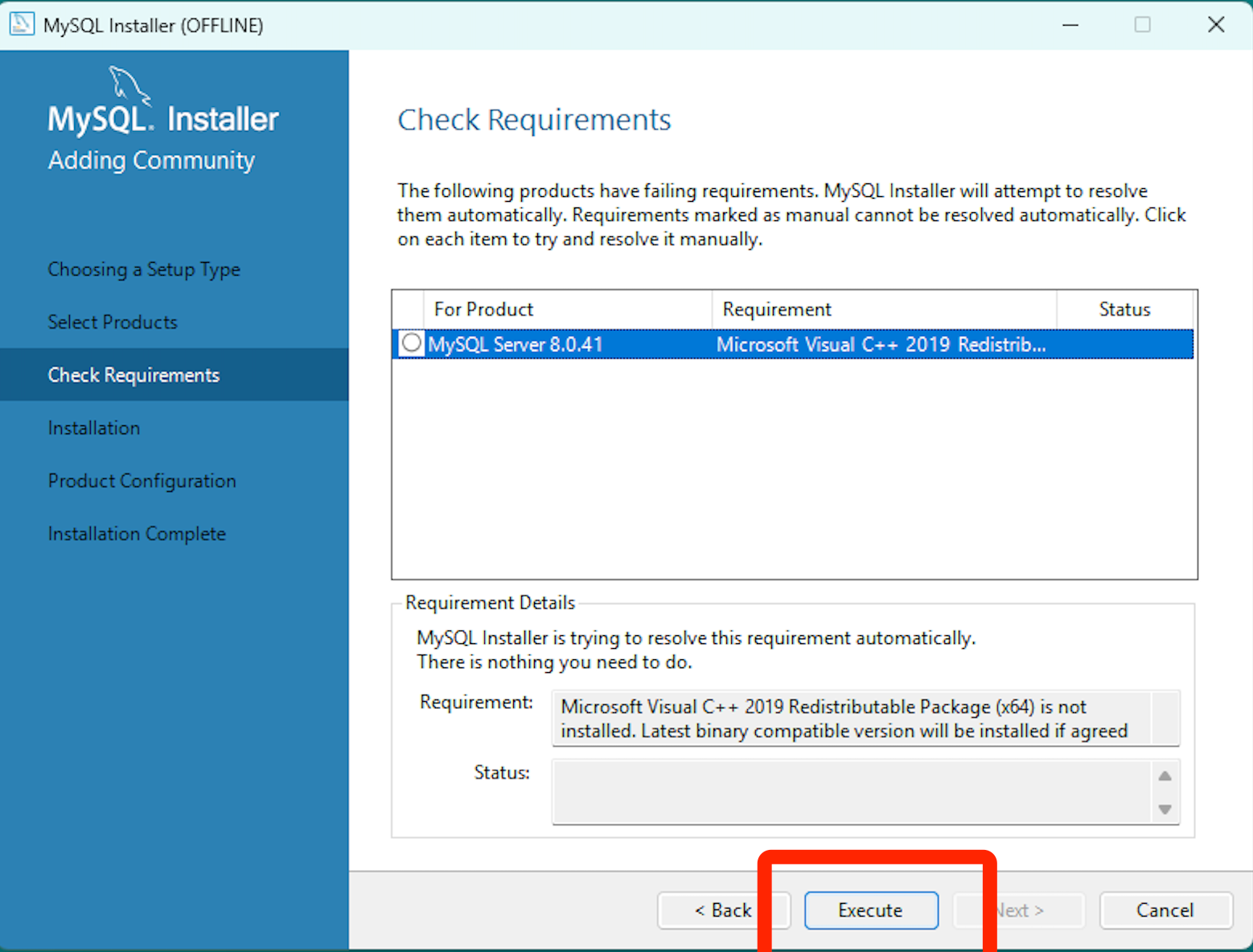 点击 "Execute" 按钮,系统开始安装 MySQL 8.0.41,安装过程中会显示进度条,耐心等待安装完成。