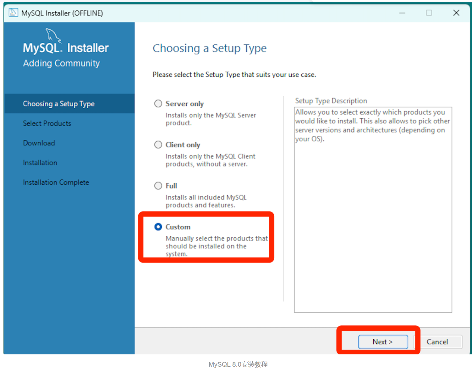 建议选择 "Custom" 自定义安装,这样可以根据实际需求选择安装组件,点击 "Next"。