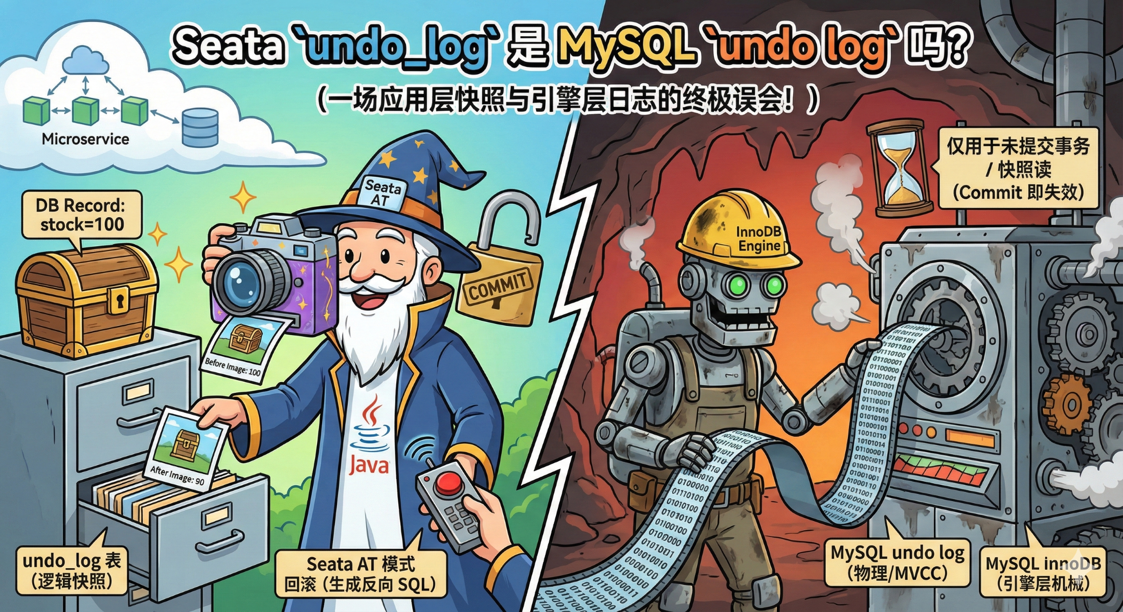 直接抛出结论:Seata 的 undo_log 完全是应用层自己生成的"逻辑日志",它与 MySQL 底层的 undo log 没有任何物理上的依赖关系。
