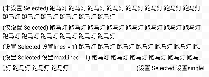 android:text="(未设置 Selected) 跑马灯 跑马灯 跑马灯 跑马灯 跑马灯 跑马灯 跑马灯 跑马灯 跑马灯 跑马灯 跑马灯 跑马灯 跑马灯 跑马灯" />