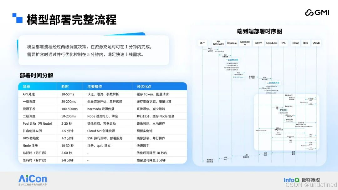 附表为模型部署全流程的时间消耗拆解,各阶段耗时均为参考值,具体时长受资源状态、网络环境等多重因素影响。在底层资源充足,且镜像与模型文件已完成预热的前提下,模型部署可实现秒级启动。