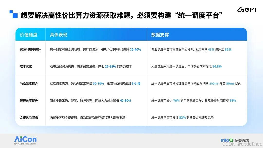 此外,全球算力资源地域失衡明显,加剧了资源管理难度。北美占比 42%、欧洲 18%、中国 15%,中东、拉美、非洲等新兴市场供给严重不足,企业使⽤这些分布不均匀的算⼒会有极大挑战。同时算力利用率普遍偏低,AI 训练场景 GPU 利用率仅 35%,推理场景 62%,数据中心平均 48%,远低于行业良好水平的 85%,核心瓶颈包括 73% 企业采用静态分配导致的资源分配僵化、推理负载 3-8 倍的峰值波动、传统系统 27% 的资源碎片率及硬件兼容差异等。