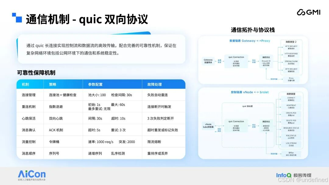 区域控制面与 BRS 层的交互依赖两条独立通信链路,分别为控制链路与请求链路。考虑到系统面向跨云场景的公网通信需求,为保障复杂网络环境下的通信稳定性,该交互链路采用 QUIC 协议承载数据传输 ------ 该协议的传输特性高度适配混合云公网场景的通信需求,同时系统额外叠加多重通信保障机制,进一步提升链路可靠性。其中,控制链路承担区域控制面虚拟节点服务与 BRSlet 之间的通信任务,主要用于传输创建 Pod 等系统内部指令;请求链路则负责区域控制面 Gateway 服务与部署在 BRS 上的 Proxy 组件之间的数据交互,核心功能是转发外部推理请求与传输业务数据。两条链路独立运行、互不干扰,从通信层面强化了系统整体稳定性。