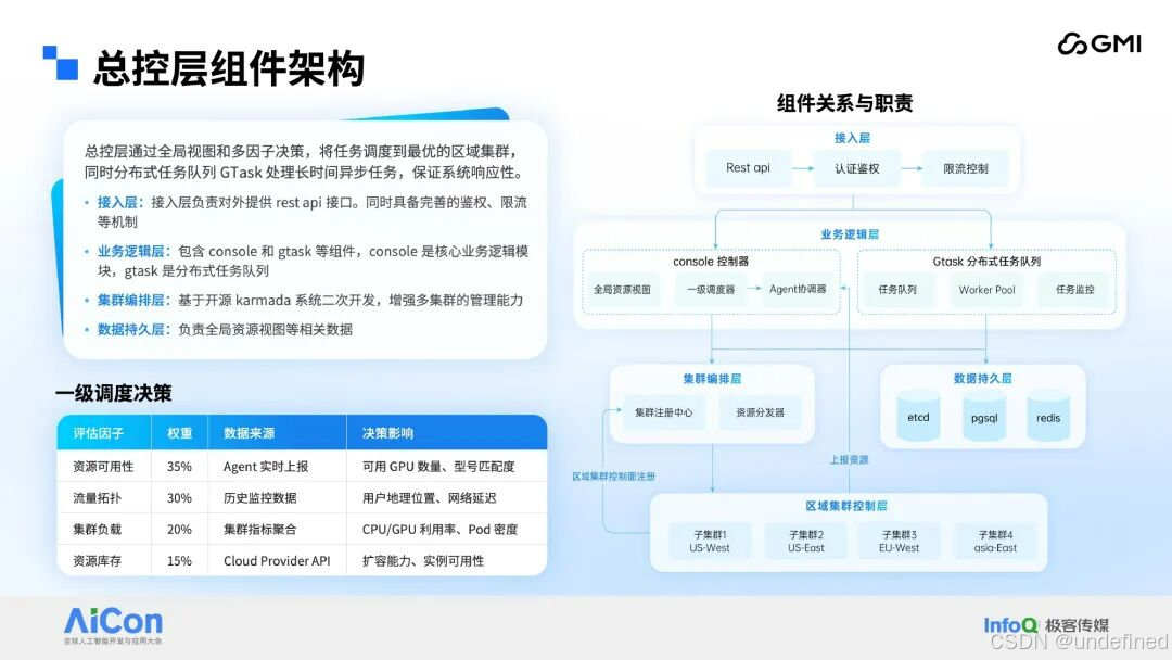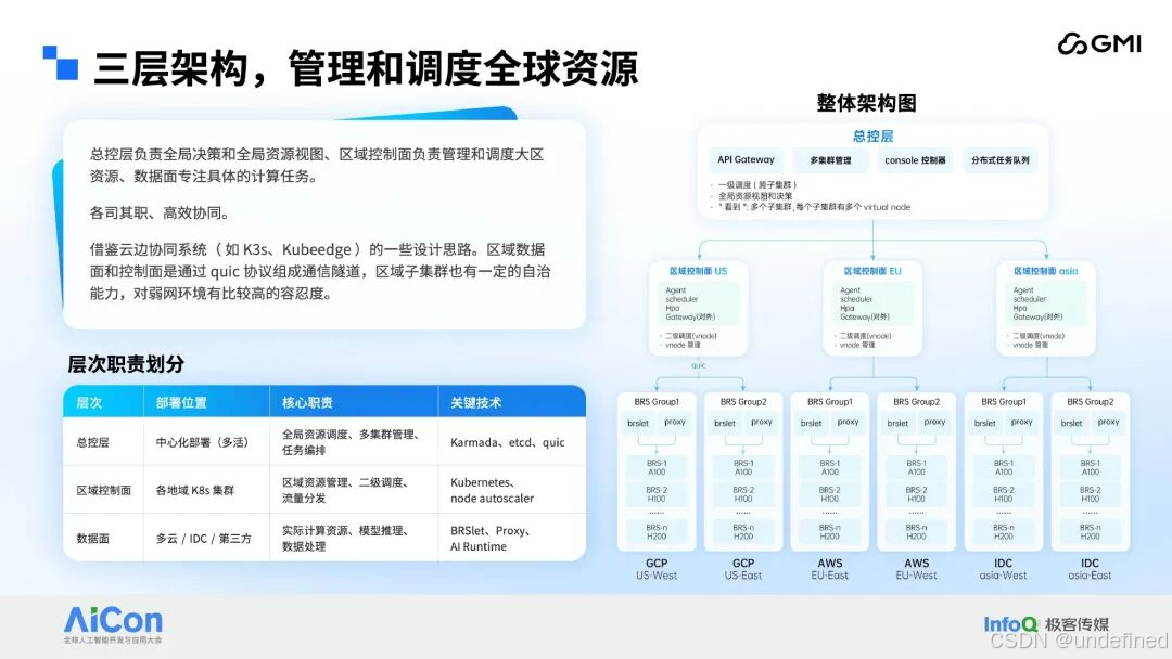 设计 "总控制层 - 区域控制面 - 数据面(BRS)" 的三层架构,搭配 "两级调度" 机制,实现对全球范围内多云异构资源的统一管控与智能调度: