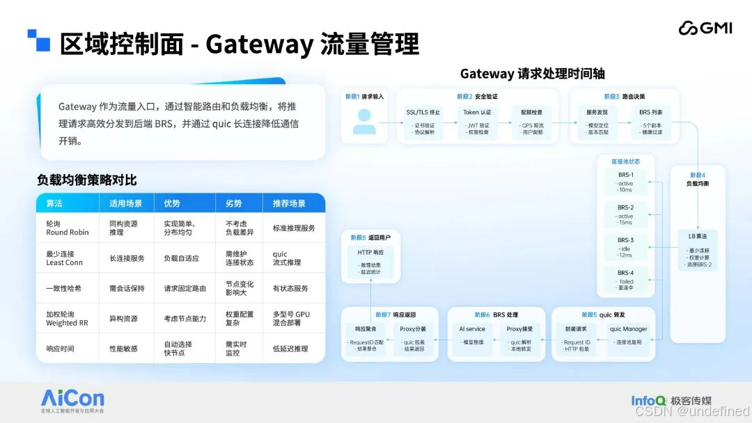 区域控制面还具备一项关键特性 ------ 流量管理。考虑到总控制层采用中心化部署,而服务的用户群体覆盖全球,若流量经总控制层转发,将导致延迟过高且稳定性无法保障。因此,对应的流量转发方案设计为仅通过区域控制面完成转发:各区域控制面均部署自研网关(Gateway)服务,该服务负责承接外部各类流量,随后通过多种路由算法精准定位后端 BRS,再借助 QUIC 协议将流量转发至 BRS 上的模型负载,最终完成请求的处理闭环。