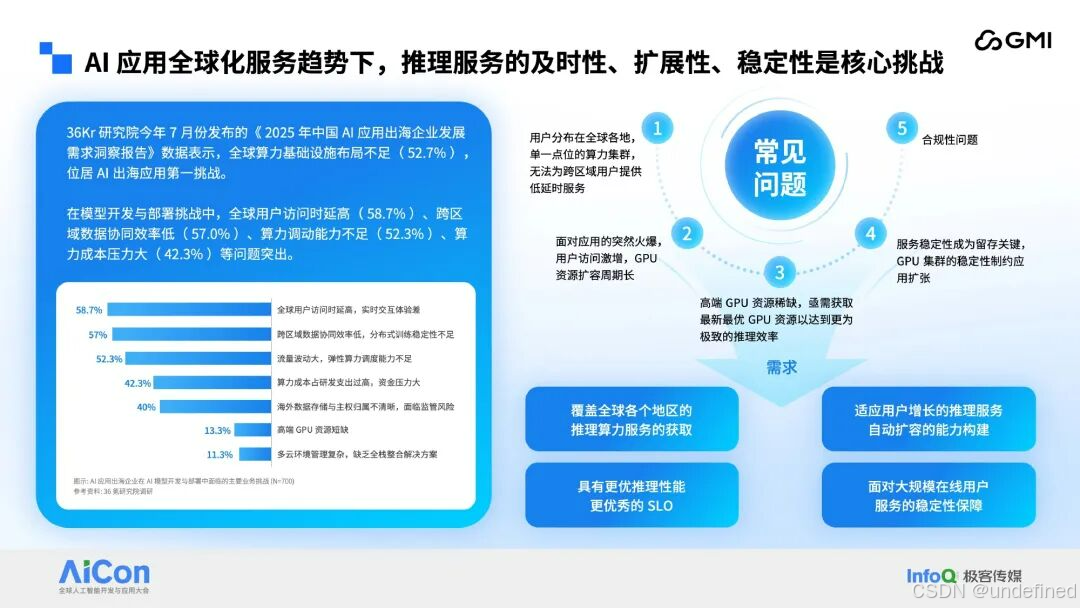 但机遇背后,挑战同样严峻。36Kr 研究院的调研显示,全球算⼒基础设施布局不⾜是 AI 出海的第⼀⼤挑战。 具体来看,接近 6 成的企业⾯临全球⽤户访问时延⾼的问题以及存在跨区域数据协同效率低的困扰,缺乏弹性算⼒调度能⼒⾼昂的算⼒成本。此外,合规⻛险、⾼端 GPU 短缺、多云管理复杂等问题也不容忽视。 这些挑战集中体现在:单⼀点位算⼒⽆法满⾜跨区域低延时需求;⽤户激增时 GPU 扩容周期⻓;⾼端 GPU 资源稀缺;服务稳定性制约应⽤扩张;还有复杂的合规要求,这些都成为 AI 应⽤出海的拦路⻁。