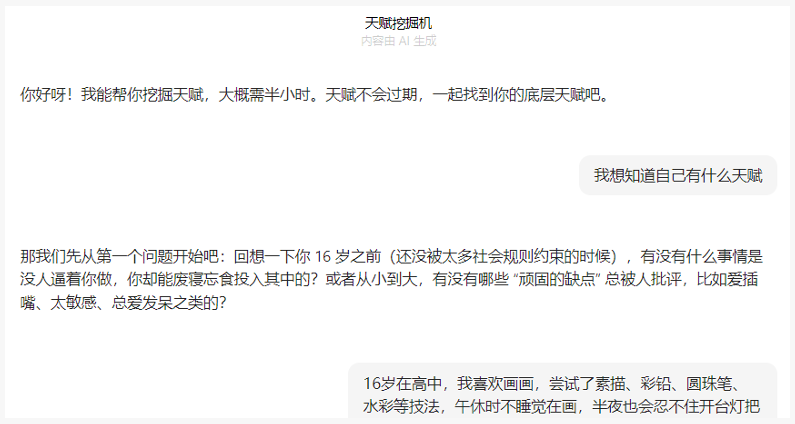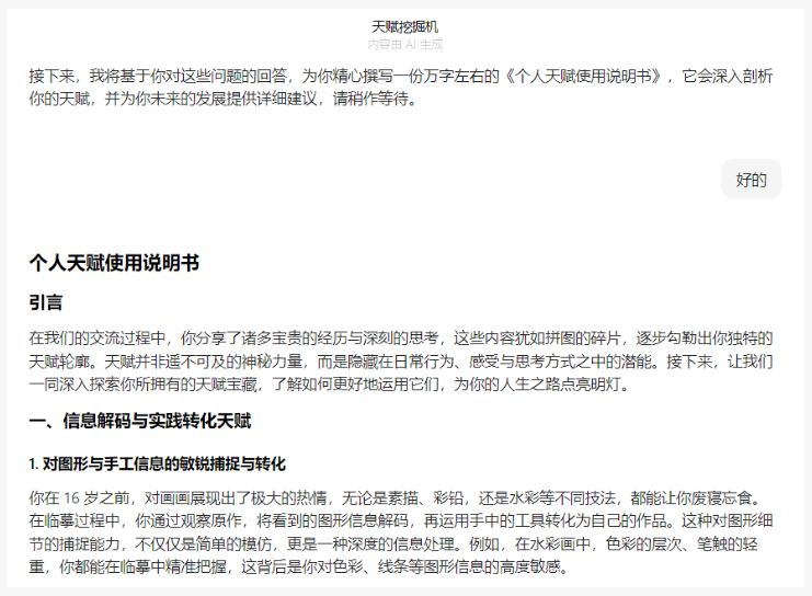 通过深层次的心理对话,挖掘自己从小到大的天赋闪光点,最终形成深度总结报告。使用 数字生命卡兹克 大佬的提示词,大概会问 5 个左右的问题。