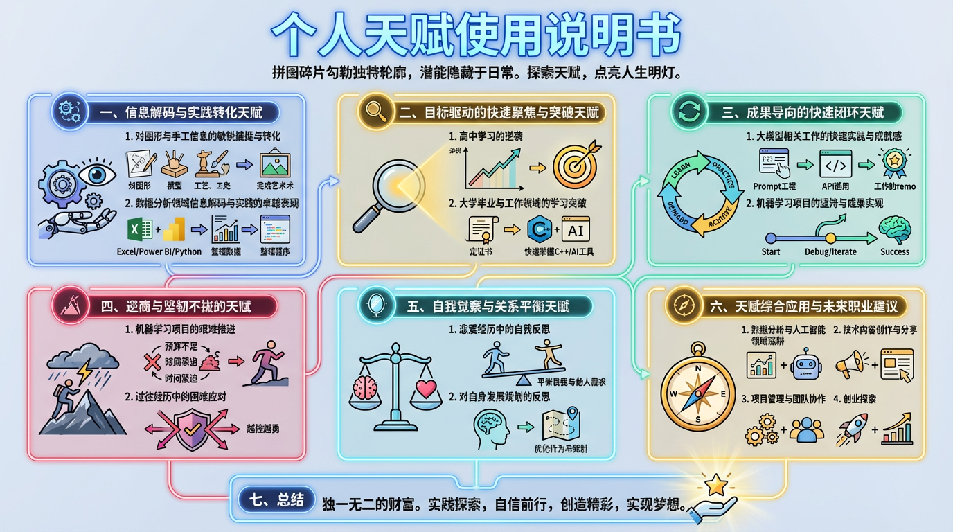 下面是用 天赋挖掘机Agent 将笔者自我剖析总结后丢给 Banana 生成的信息图(生图提示词见笔者的上一篇文章):