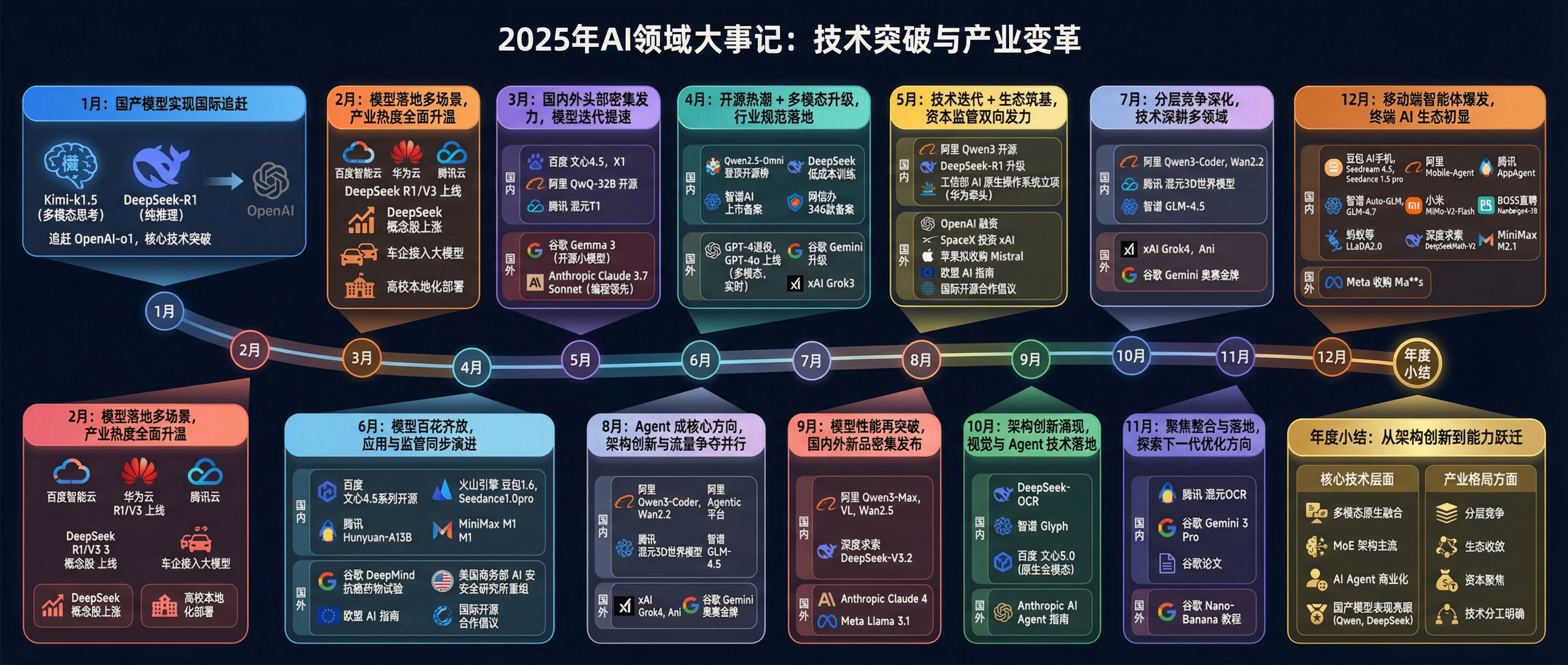 从2025年春节的早晨阅读一篇关于 DeepSeek 的文章开始,我才意识到这世界马上、甚至已经天翻地覆。对这热潮随波逐流,至今已临近下一个年关,可见国内的创新亦是常有勃发,也该将学习历程回顾一番,以便来年急流勇进。本文以笔者浅见为主,从国内外大模型的关键技术节点出发,梳理每月的大事记,并附上 Q4 的《AI生产力再探再报》。让我们一起来瞅瞅,这一年里 AI 的发展与变化吧!~
