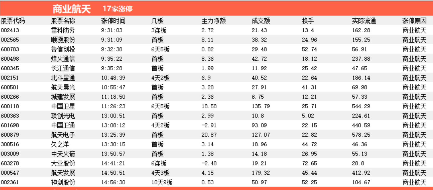 A: 从涨停家数统计 热门概念:商业航天,板块龙头: 大业股份,核心容量标的为:航天发展。