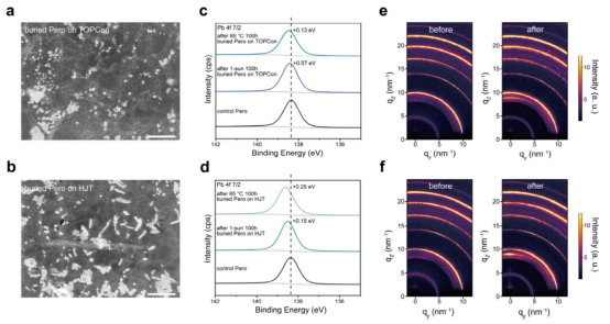 (a) Pero/TOPCon和(b) Pero/HJT串联器件的扫描电子显微镜图像(c) Pero/TOPCon和(d) Pero/HJT串联器件中对照钙钛矿与埋底钙钛矿在热老化和光老化后的Pb 4f X射线光电子能谱(e) Pero/TOPCon和(f) Pero/HJT堆叠结构在加速热老化前后的二维掠入射广角X射线散射图像