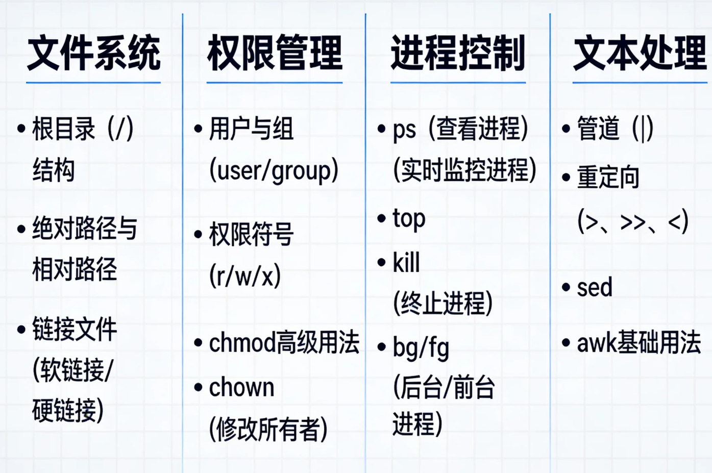 度过了基础命令的破冰期,这一阶段我们要从"会用"升级到"理解"------搞懂 Linux 文件系统结构、权限管理原理、进程控制方法,以及文本处理技巧。这些内容是后续编写 Shell 脚本的基础,也是真正理解 Linux 系统的关键。