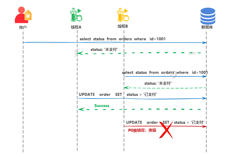 首先要明白网络请求到后端一定是高并发多线程的去处理请求的,所以两次的支付请求如果都是先查后改的话会出现下图这样的问题: