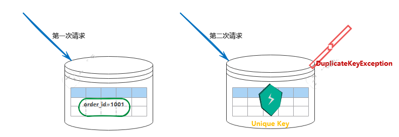 在数据库里建一张"流水表(Payment_Log)",把 order_id 或者 全局唯一流水号 建为 Unique Key(唯一索引)。请求来了,先往流水表插数据。如果插成功了,说明是第一次请求,继续跑业务。如果报了 DuplicateKeyException(主键冲突),说明是重复请求,直接 Catch 异常,返回"支付成功"。