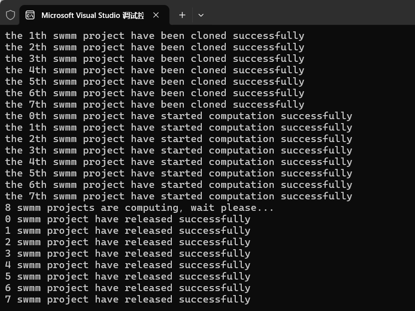 本案例利用SwmmProjectClone函数实现projectClass的深度拷贝,并利用多线程对8个swmm模型进行同时计算,可以实现多个线程同时计算多个模型,可以使用projectClass相应的参数修改功能,实现不同模型参数设置情况下的多个模型的同时计算,本案例没有修改模型参数,仅仅实现了8个相同的模型同时计算。
