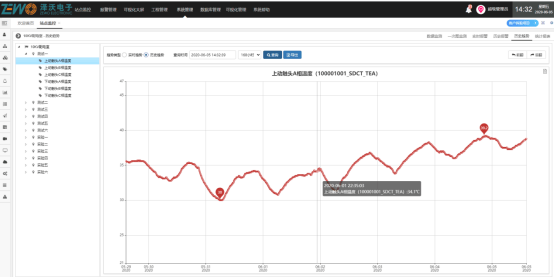 温度曲线:通过温度曲线图的查询,我们可以精确看到某个历史时刻的温度数据;也可以通过历史曲线变化,辅助电网分析柜体运行状态,提前做好维护准备。