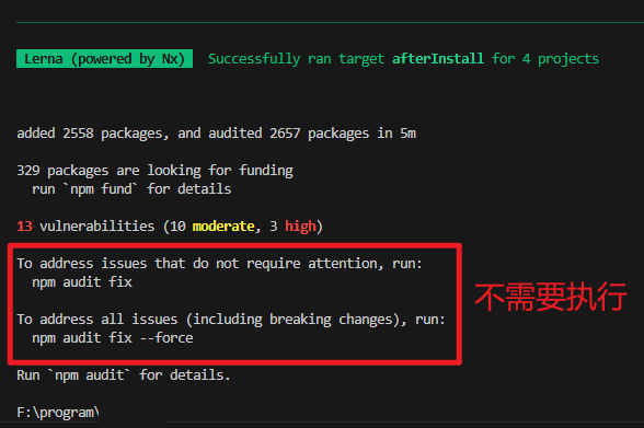 ❗❗注意,如果执行完 npm ci 后,下边有提示指令 npm audit fix,千万不要执行fix指令,因为执行后就会更新package-lock.json了。。