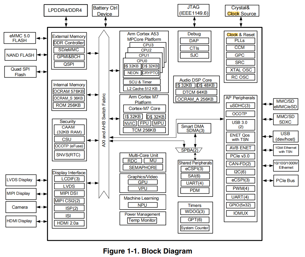 专给音频 DSP 或 Cortex-M7 用的"音频 RAM",做 48 kHz/192 kHz 低延迟链路时,把代码/数据放这里,省得和 A53 抢外部 DRAM 带宽。 - OCRAM_S 36 KB