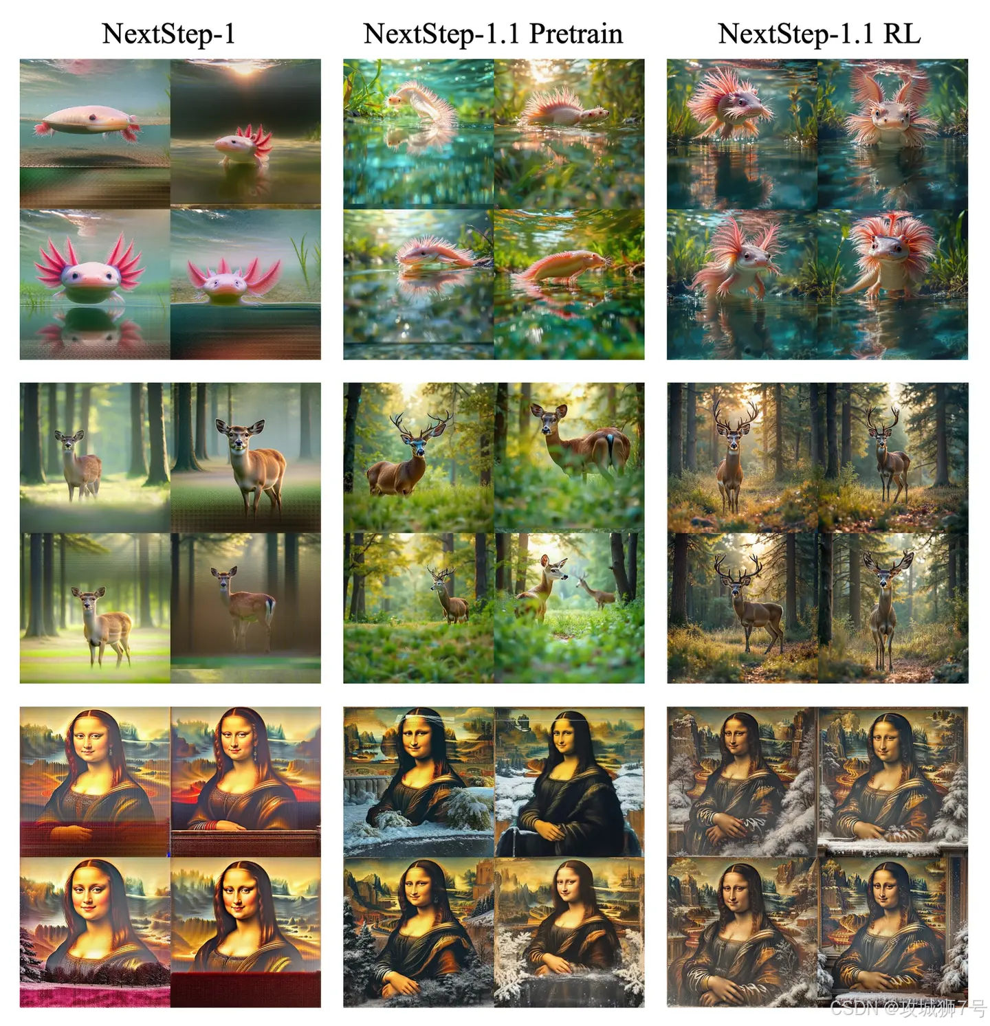 在图像生成领域,强化学习通常是用来对齐人类偏好的。NextStep-1.1把RL用在了"磨皮"上。它通过后训练(Post-training),强行修正了模型生成的纹理细节。
