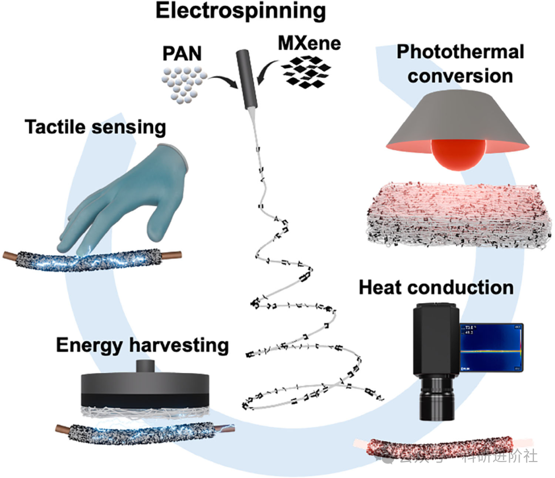 该研究展示的PAN-MXene复合纤维及纱线,首次通过单一、可扩展的静电纺丝平台,成功整合了高效导热、光热响应、摩擦发电和触觉传感四大功能。