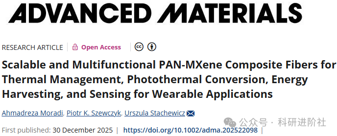近期,波兰AGH克拉科夫大学的Moradi、Szewczyk和Stachewicz教授团队在顶级材料学期刊《Advanced Materials》上发布重要成果,他们成功研制出一种多功能PAN-MXene复合纤维,通过简便高效的静电纺丝技术,将导热、光热转换、摩擦发电与触觉传感四大功能集于"一纤",为下一代智能穿戴设备提供了革命性的材料解决方案。