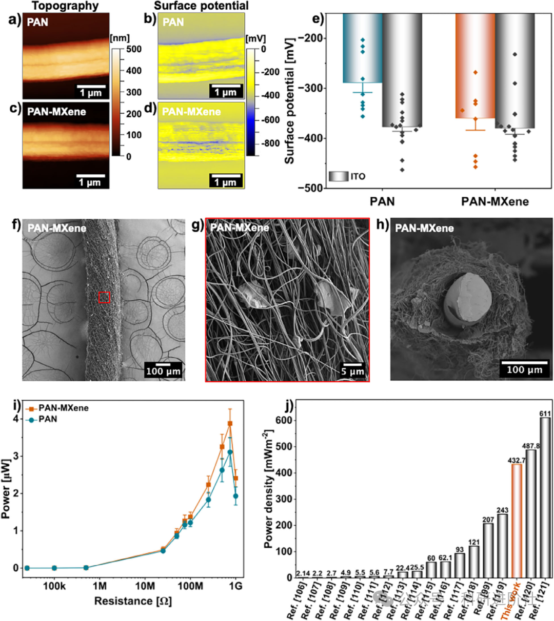 2.自供电的能量收集:MXene的加入使纤维表面电学性质发生改变,摩擦电负性大幅增强。基于此制成的纱线,在与尼龙等材料简单摩擦接触时,就能高效收集机械能并转化为电能,最大输出功率密度达到432.7mW/m²,性能位居同类材料前列。