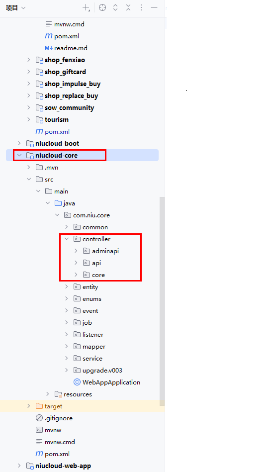 打开系统你会发现 controller 下又 adminapi,api,core 子项文件夹,这里是系统将不同的端口放在一起统一管理,包括后期插件开发也是分成不同端口。