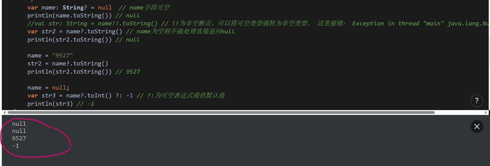 var str3 = name?.toInt() ?: -1 // ?:为可空表达式提供默认值