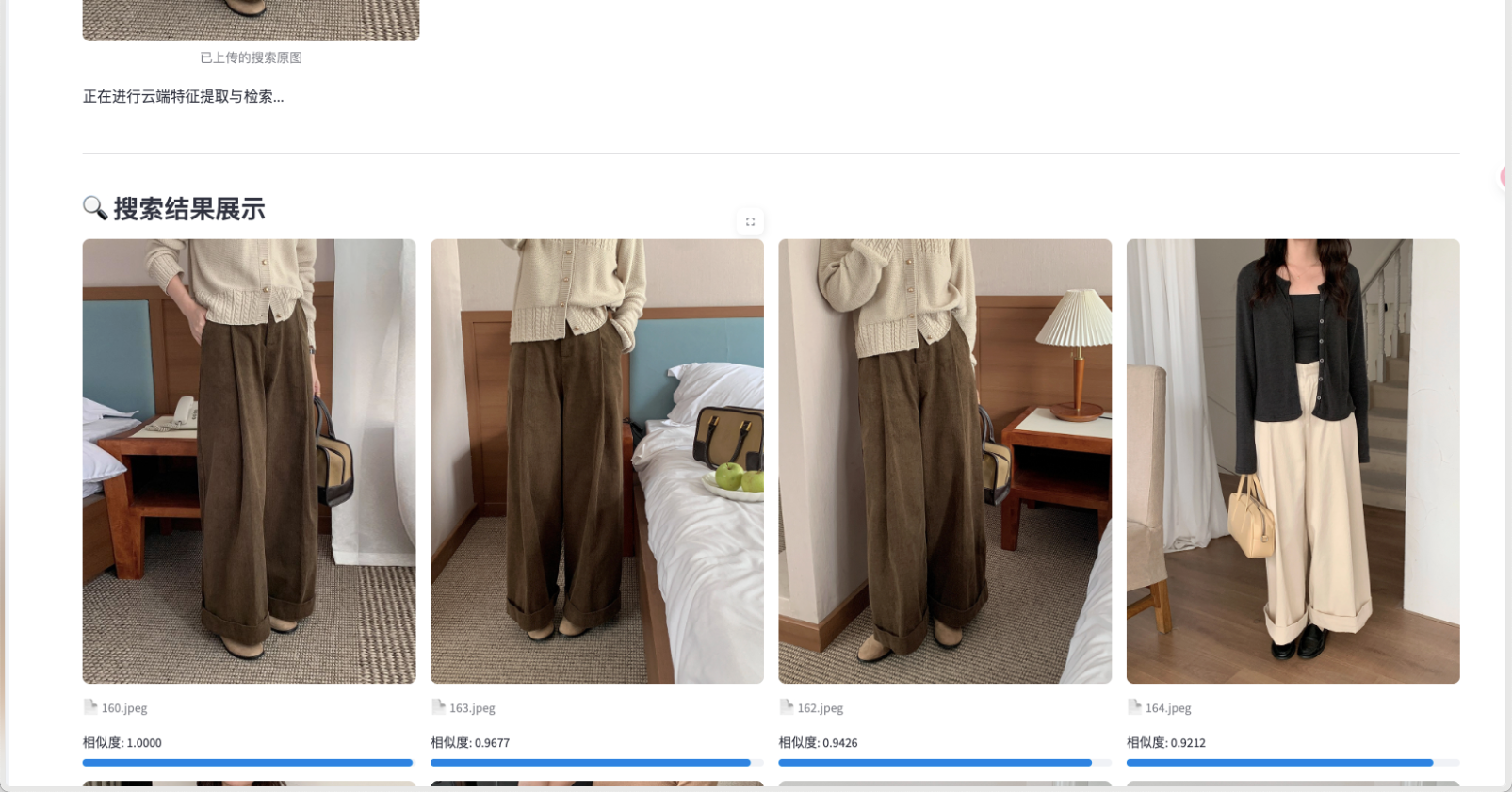 在服装这种高度依赖视觉特征的类目下,AI 表现惊艳。上传一张阔腿裤样照,系统在 219ms 内即可找回库中所有剪裁相似的单品,相似度分数极高。