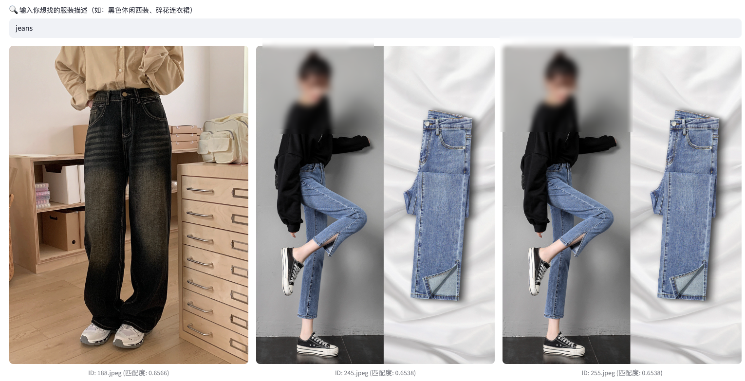 - Bug:搜 "jeans" 准确,但搜"牛仔裤"却出了"西裤"。