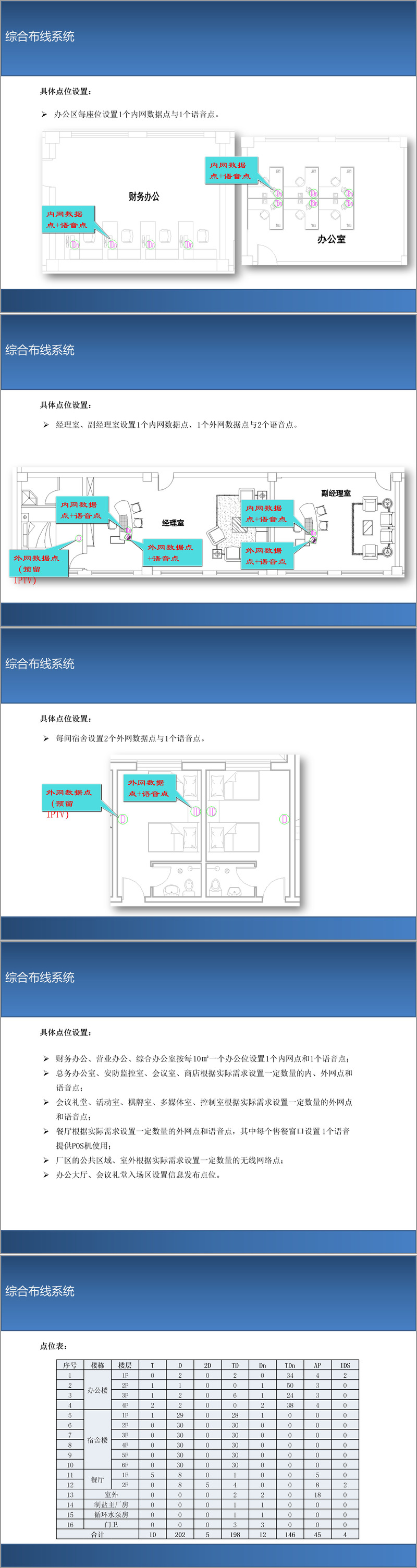 综合布线系统作为信息传输的"高速公路",采用六类非屏蔽布线系统,数据和语音可互换,主干数据采用多模光纤,语音采用三类大对数铜缆,确保前端实现"千兆到桌面"。点位配置细致入微,例如办公区每个座位设置1个内网数据点和1个语音点;经理室等增设外网数据点;每间宿舍设置2个外网数据点和1个语音点;食堂售餐窗口则专门设置语音点供POS机使用。