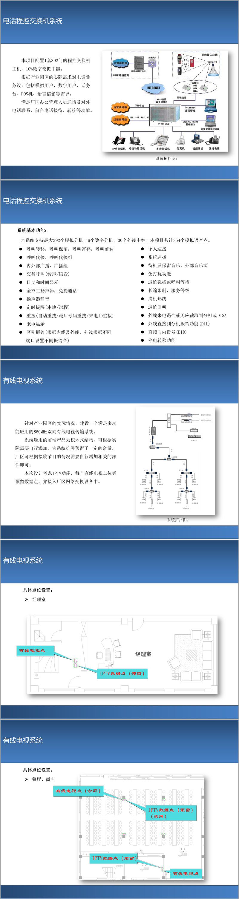 为满足园区通信与信息获取需求,方案配置了一套392门的程控电话交换系统,支持模拟用户、数字用户、话务台等多种业务功能。同时,建设了一套860MHz双向有线电视系统,共计187个点位,主要分布于宿舍、餐厅及经理室等区域,并考虑IPTV功能,为每个电视点位预留网络接口。