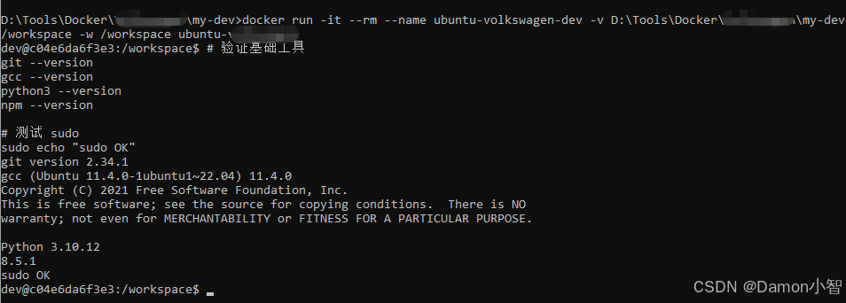 docker run -it --rm --name ubuntu-dev -v D:\Tools\Docker\my-dev:/workspace -w /workspace ubuntu-demo