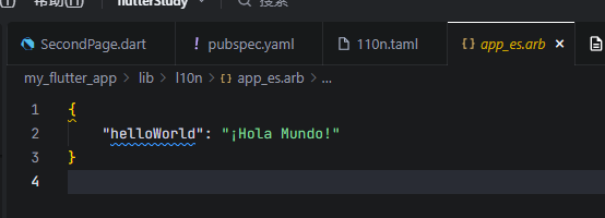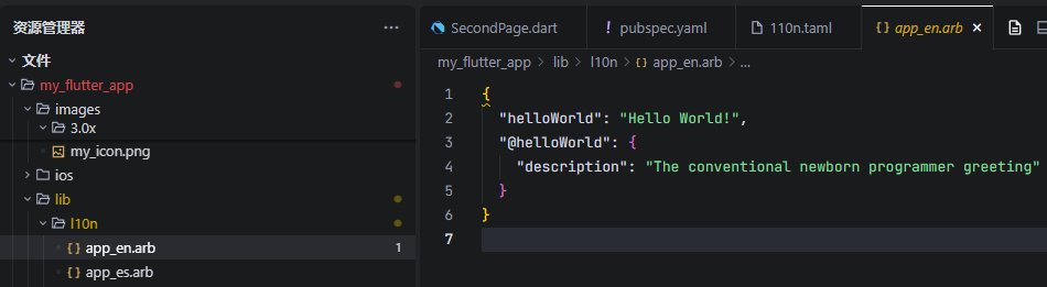 在同一目录下添加另一个名为 app_es.arb 的捆绑文件。在这个文件中,添加同一条消息的西班牙语翻译。